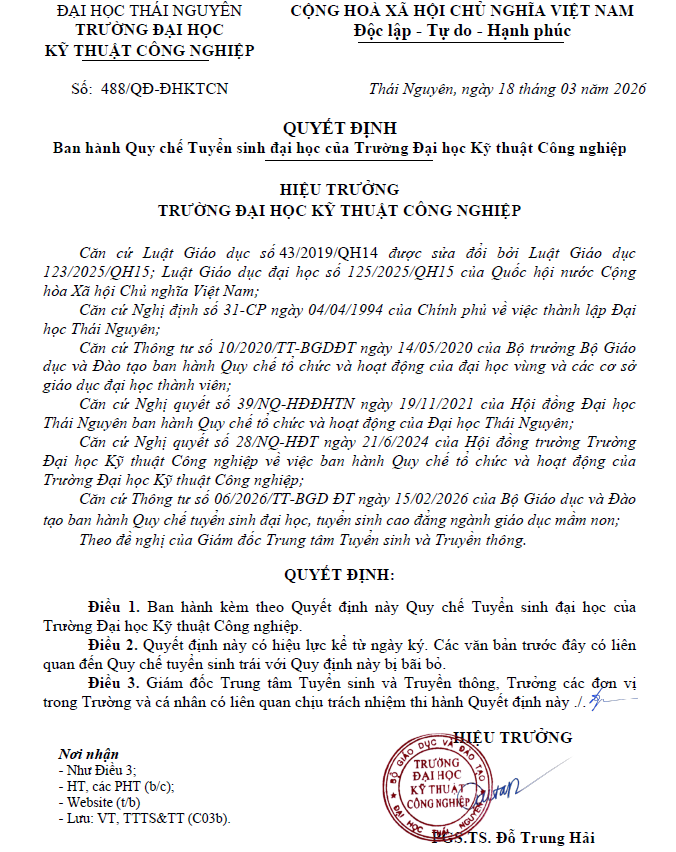 Tin bài viết Quyết định ban hành Quy chế Tuyển sinh đại học của Trường Đại học Kỹ thuật Công nghiệp 08/04/2026 09:47 Xem thêm chi tiết và phục lục quy chế tuyển sinh ở đây >>>> Chia sẻ Facebook Twitter Copy link